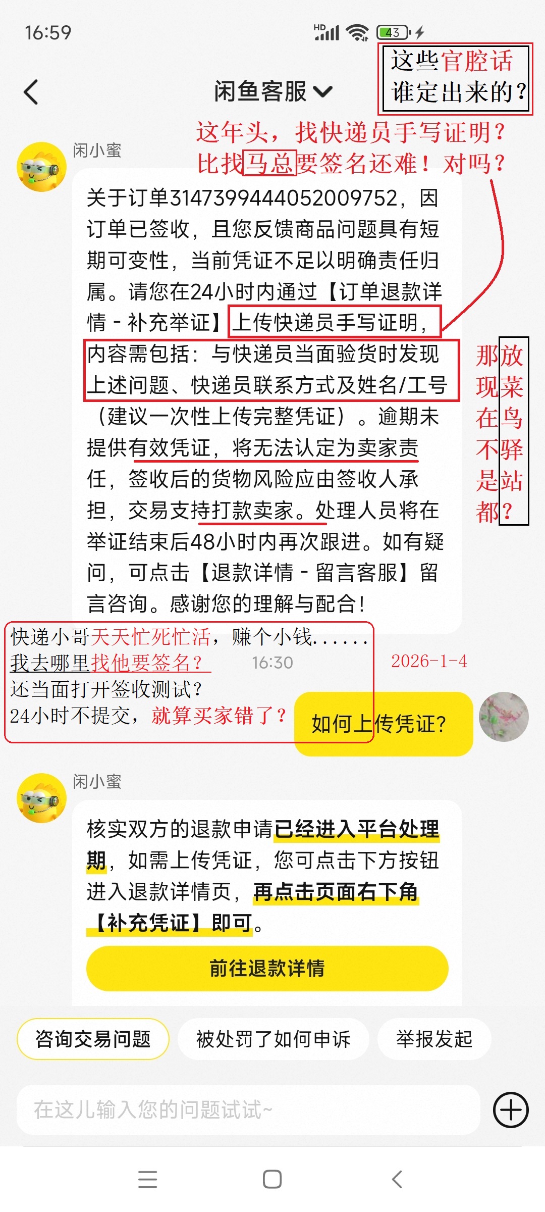 2026-01-04 闲小蜜要求,买家在24小时内,上传快递员手写证明,逾期将无法认定责任。