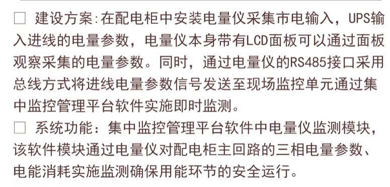 描述:建设方案:在配电柜中安装电量仪采集市电输入,UPS输入进线的电量参数,电量仪本身带有LCD面板可以通过面板观察采集的电量参数。同时,通过电量仪的RS485接口采用总线方式将进线电量参数信号发送至现场监控单元通过集中监控管理平台软件实施即时监测。 系统功能:集中监控管理平台软件中电量仪监测模块该软件模块通过电量仪对配电柜主回路的三相电量参数电能消耗实施监测确保用能环节的安全运行