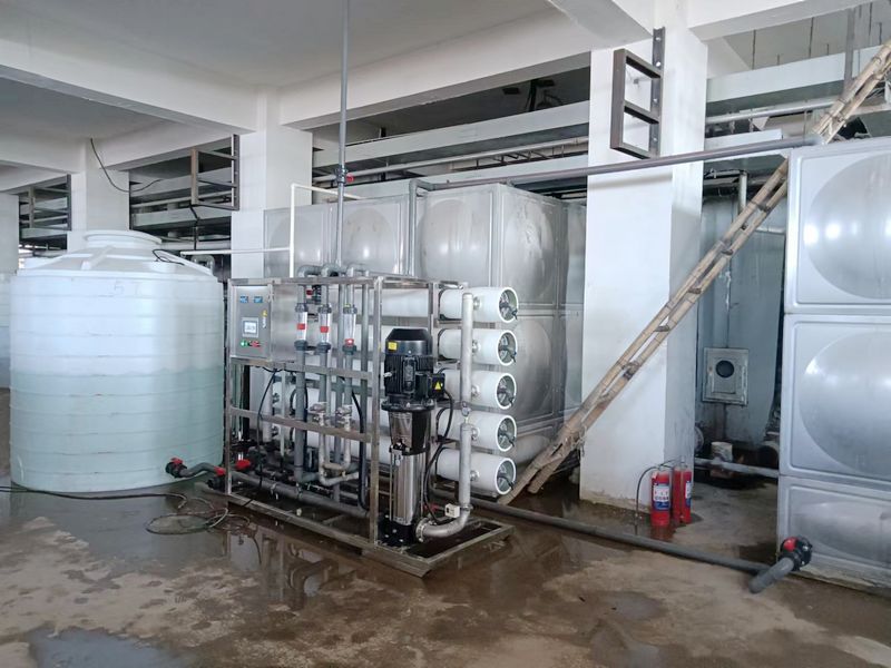 自来水→电动阀→多介质过滤器→活性炭过滤器→软化水器→中间水箱→低压泵 →精密过滤器→一级反渗透→PH调节→混合器→二级反渗透(反渗透膜表面带正电荷) →纯水箱→纯水泵→微孔过滤器→用水点